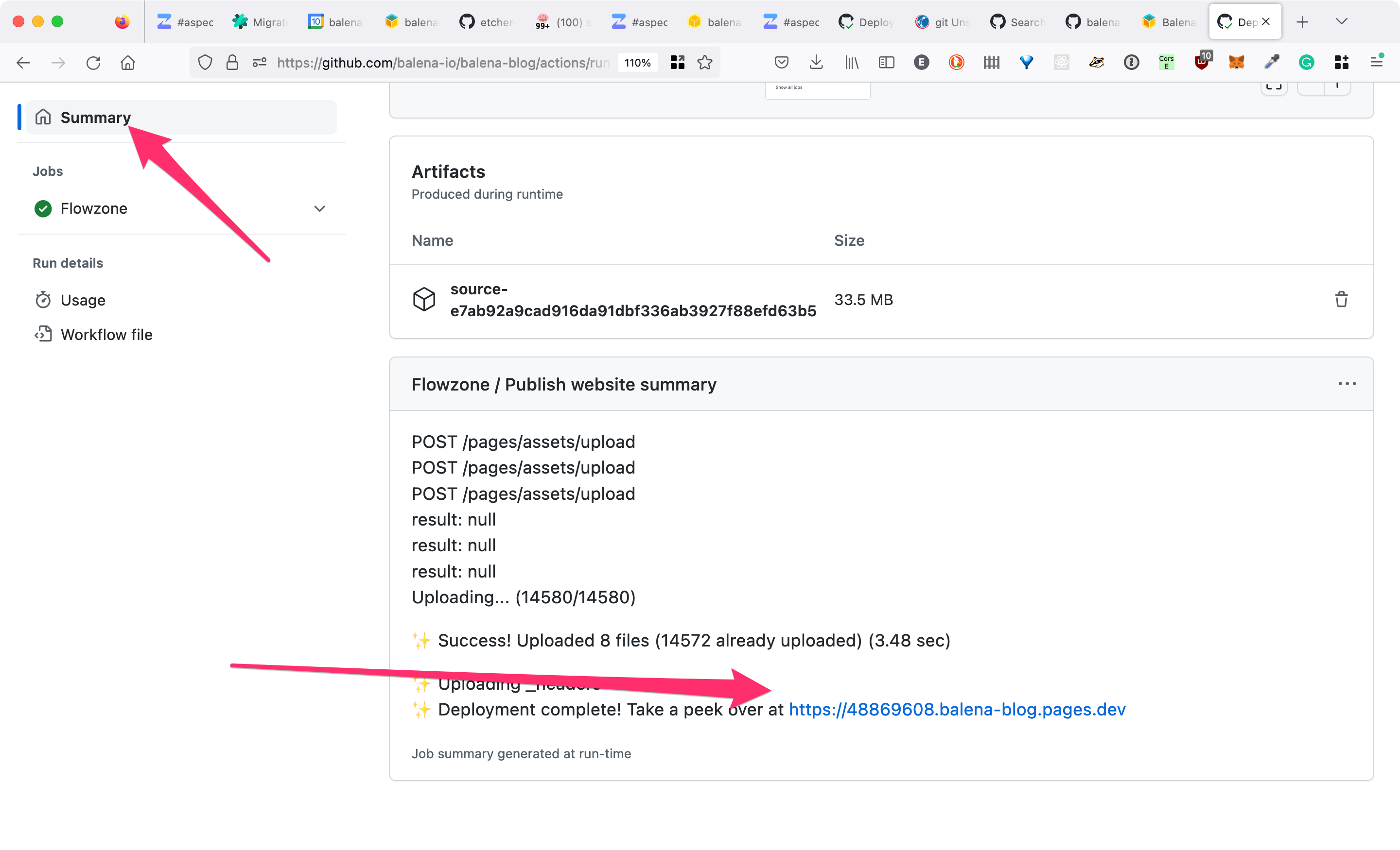 - If everything went well, then a preview URL will appear in the Flowzone run summary which you can use to view your docs website